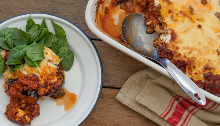 6. فى صينينة نرص نصف شرائح الباذنجان المجهزة من قبل ثم نضع اللحم المفروم ثم القليل من صوص البشاميل ثم نرص باقى الباذنجان ثم فوقة نضع باقى البشاميل.