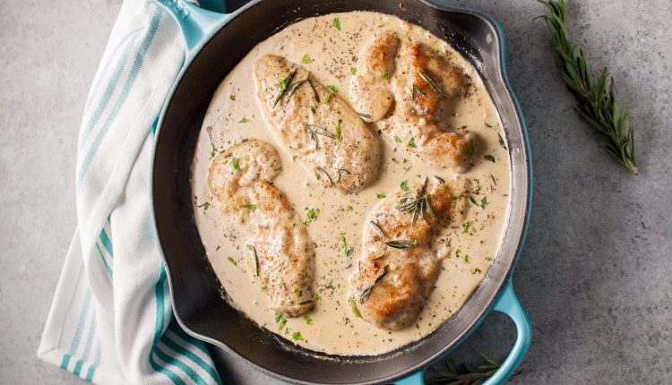 توضع كل المكونات في الخلاط ما عدا صدور الدجاج ونقوم بخلطهم جيدا.