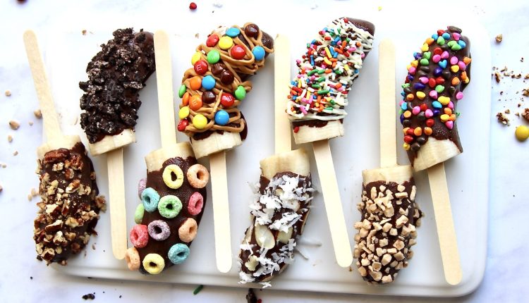 نقوم بتقشير الموز ويثبت عصيان الكيك بوبس فيه بحذر شديد.