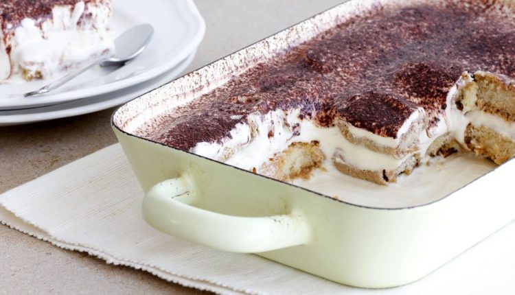 تُصّف طبقة من البسكوت في صينية بايركس وتوزع كمية مناسبة من خليط الكريمة فوقه.