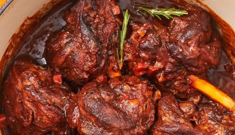 – اسكبوا المرق وصلصة البندورة، ثم أعيدوا قطع اللحم إلى القدر وأضيفوا الروزماري واتركوه يغلي ثم يغطى ويوضع بالفرن مدة ساعتين حتى تنضج قطع اللحم.