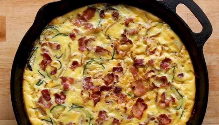 - اسكبي مزيج البيض فوق الخضار ثم ضعي اللحم المقدد.