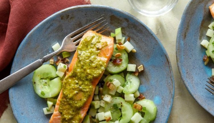سلمون بصلصة البيستو مع الخيار وسلطة التفاح الأخضر