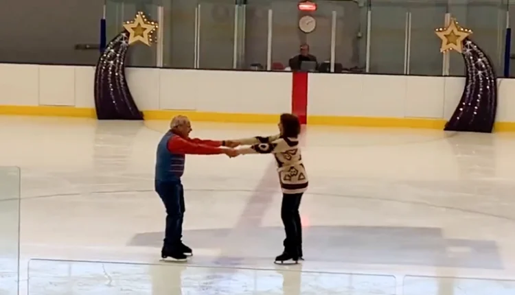 وتزلج المسن وحيدا دون أي مساعدة من معلمته، وبانسيابية ملحوظة، ثم رقصا معا دون أي صعوبات.