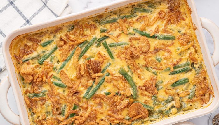 – انقلوا خليط الفاصولياء الخضراء إلى طبق خزفيّ ورشّوا البصل المقلي والجبن المتبقّي، ثم اخبزوها في الفرن حتى يذوب الجبن ويبدأ البصل في التحوّل إلى اللون البني.