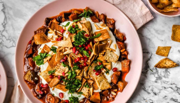 من أشهر الأكلات الشامية وخاصات بموائد رمضان هي فتة الباذنجان بالزبادي واللحم المفروم حضريها على طريقة “يمي” واسعدي بها عائلتك.