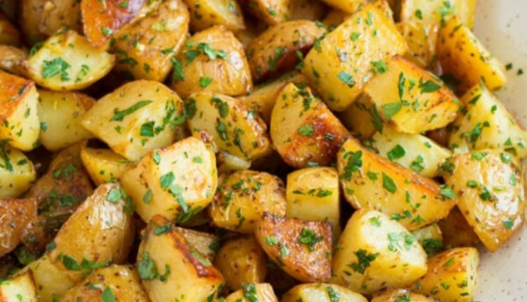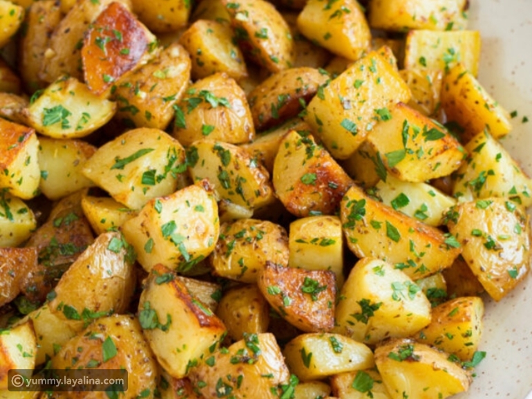 ضعي البطاطس في صينية الفرن وصبي مزيج الزيت وأدخليها الفرن لمدة 45 دقيقة حتى تنضج.