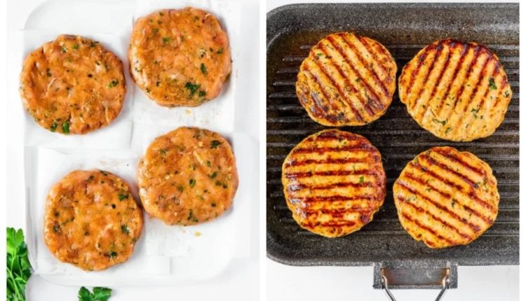 شكلي خليط البرجر على شكل أقراص دائرية وضعيها في صينية الفرن المدهونة بالزيت، ثم اشويها في الفرن أو في الشواية الكهربائية لمدة أربع دقائق على كل جهة، أو حتى تتحمر.