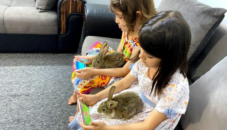 وبعد أسبوع من اقتنائهما، يقول الأب “صرنا نرى الأرنبين مع ابنتيّ يفترشون الأرض لمشاهدة أفلام الكارتون سويةً بكل اهتمام”.