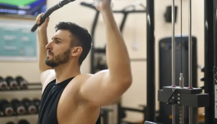 وهو من أهم التمارين لعضلات الظهر، ويبدأ بالجلوس على مقعد آلة السحب، مع لّف كتفيك للخلف والأسفل، والاحتفاظ بهما في هذا الموضع حتى تصل للإمساك بالبار الحديدي المتدلي من فوقك. وبقبضة مرفوعة أوسع من عرض الكتفين، اسحب البار نحو صدرك بحيث ينزل كلا المرفقين لأسفل ثم يتراجعان قليلا، والعودة إلى وضع البداية مرة أخرى.