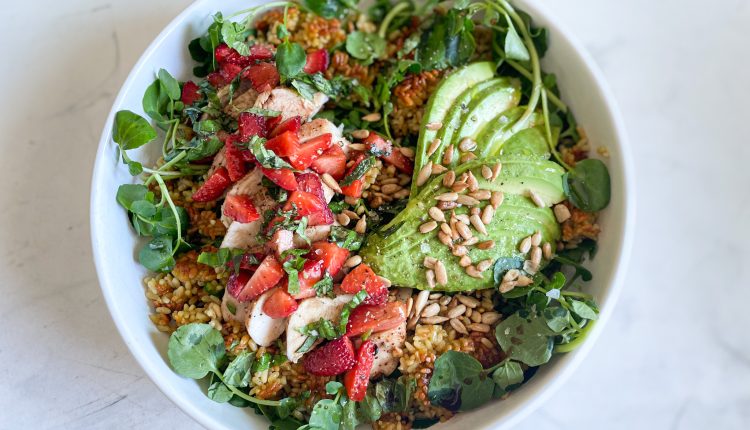 سلطة البقلة مع الفراولة… ولا ألذّ مع صلصة الفاكهة الشهيّة