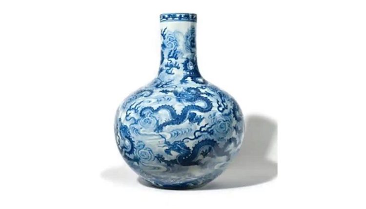 ووصفت دار المزادات المزهرية، المصنوعة من خزف أزرق وأبيض ومزينة بالمينا مع زخارف على شكل تنانين وسحب، بأنها “عادية للغاية”.