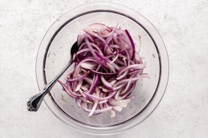 وفي الوقت نفسه، قم بتقطيع البصل الأحمر إلى شرائح رقيقة جدا وضعها في وعاء كبير. ابشر قشر الليمون في الوعاء، ثم اضغط على عصيره في الوعاء. ضع البصل في العصير ثم اتركه لينقع بينما تشوى البطاطس.