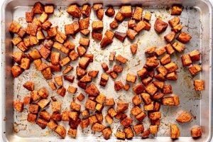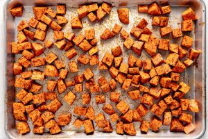 قشر البطاطا الحلوة، إذا رغبت في ذلك، وقطعها إلى مكعبات . ضعها على ورقة خبز ذات حواف. رش ملعقتين كبيرتين من زيت الزيتون ورش مسحوق الفلفل الحار و1/2 ملعقة صغيرة من ملح كوشير.