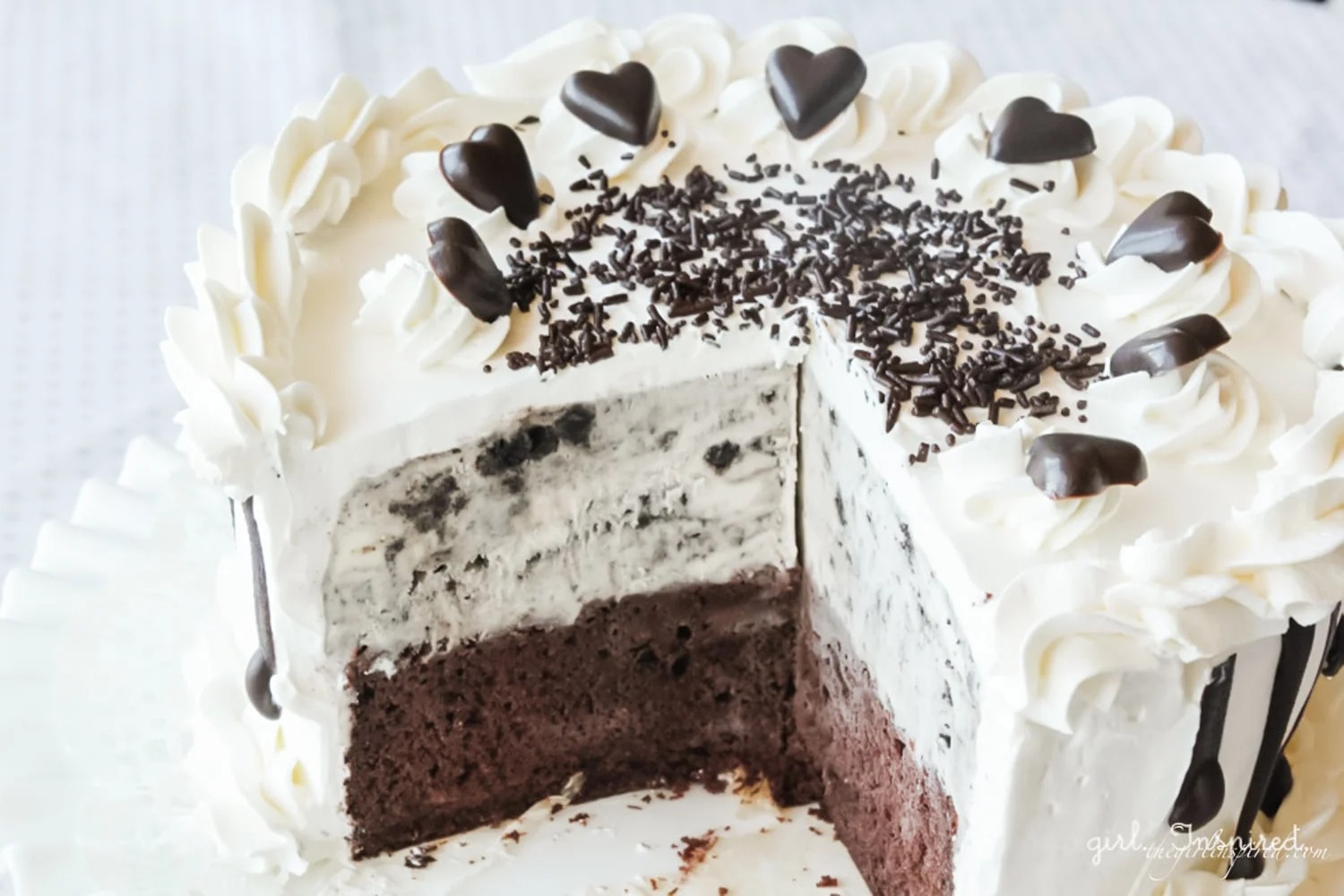 لتحضير القالب نضع طبقة الكيك، وطبقة من غاناش الشوكولا، ثمّ نغطّي بقالب الـ”آيس كريم”، بعدها نزيّن القالب حسب الرغبة