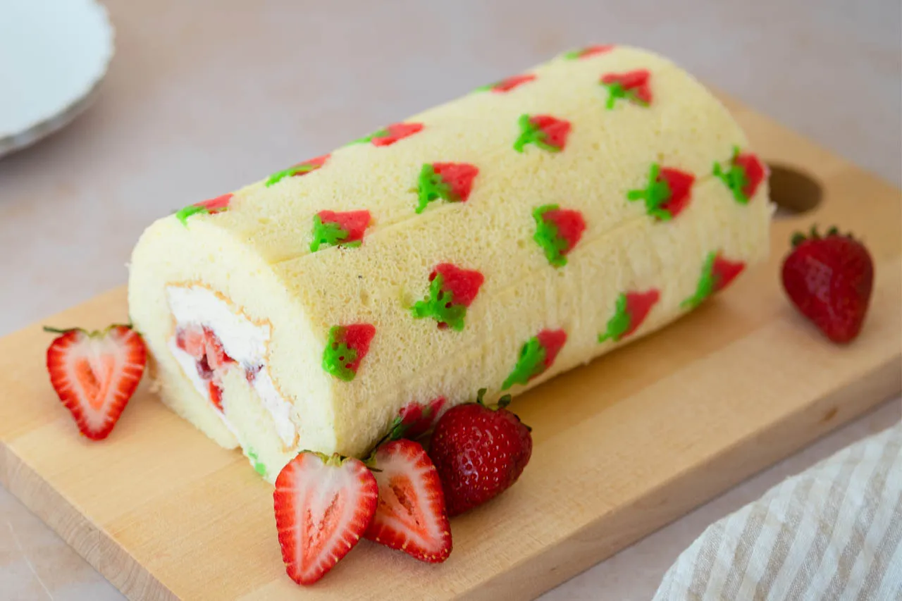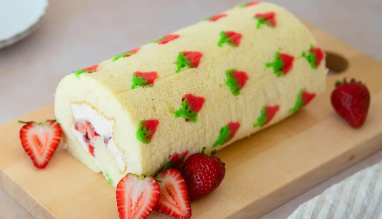 - افردي رول الكيك ومي خليط الكريمة بالفراولة داخله مع ترك الجوانب فارغة، وستزيد كمية من الحشو.