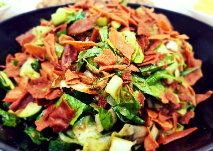 – الخطوة 3: لتحضير صلصة الفتّوش، نضع في وعاء الثومَ المهروس، السمّاق، زيت الزيتون، دبس الرمان، الملح والحامض، ونمزجها معاً، ثم نضيفها على الفتّوش، ونزيّن الطبق بالخبز المقليّ.
