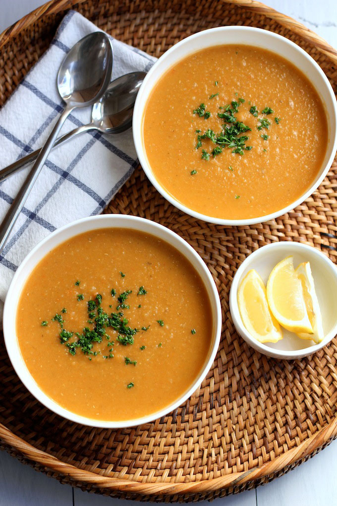 – نترك الحساء يُطبخ على النّار، ثم نطحن جميع المكوّنات مع بعضها، ونقدّمها ساخنة مع رقائق الحرّ والليمون الحامض.