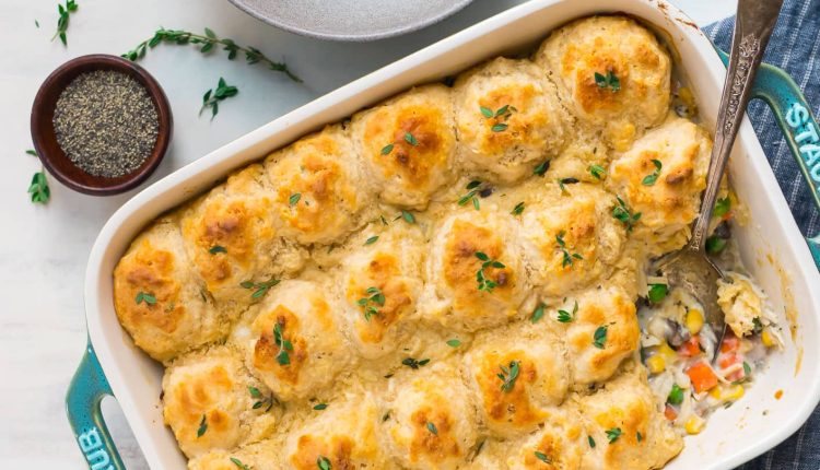 – تُخرج الوجبة من الفرن، وبشكل فوري، يتمّ وضع ¼ كوب من عجينة البسكويت بالتساوي على الوجبة الساخنة في الصينية.
