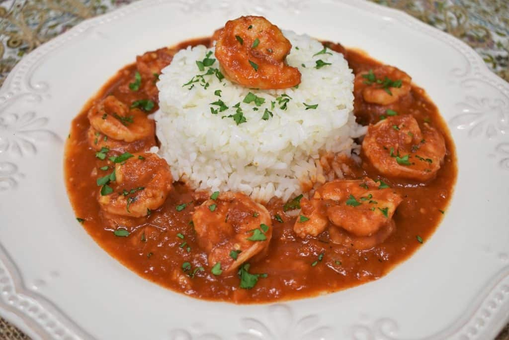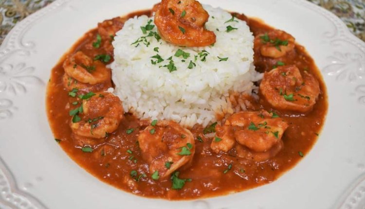 - نسكب الأرز في طبق، ونضع فوقه الروبيان، والبصل المكرمل، واللوز المقطع والمقلي، ثم نرش البابريكا.