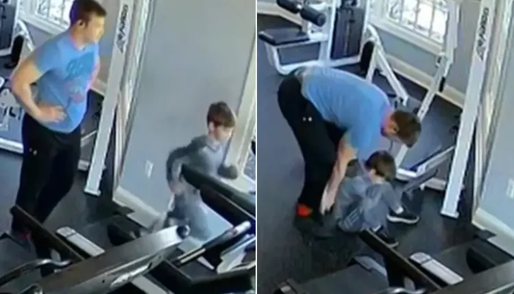 ووقع الطفل فقام والده برفعه ووضعه مرة أخرى على جهاز المشي، مما أجبر ساقي الطفل على الثني للخلف، فيما بدا أن الأب قد ثبت أسنانه في رأس كوري.