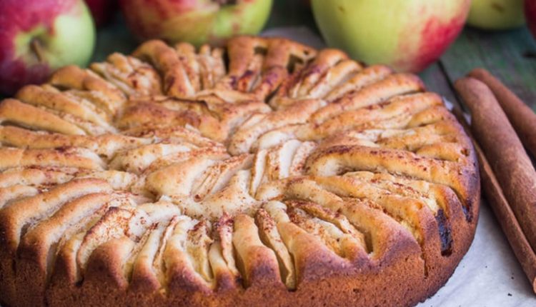 - جهزي قالباً مقاس 30 سنتيمتراً × 13 سنتيمتراً، وضعي فيه التفاح، ثم المزيج فوقه، واخلطي جيداً.