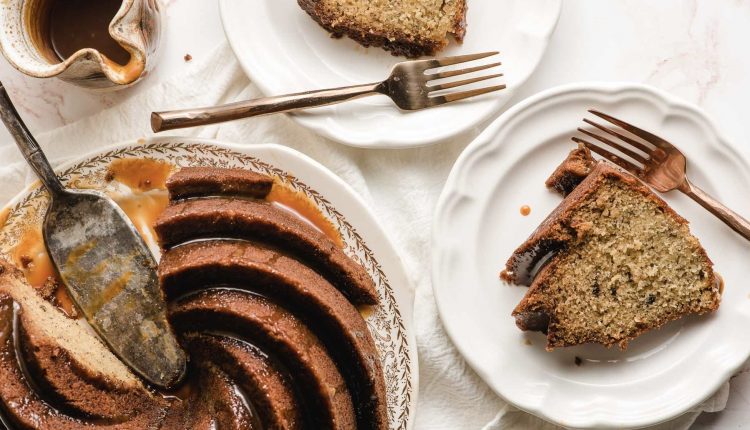 2. بطني قالب الكيك بورق الزبدة، وصبي خليط الكراميل، ووزعيه بقاع القالب.