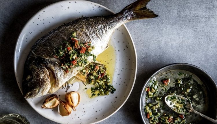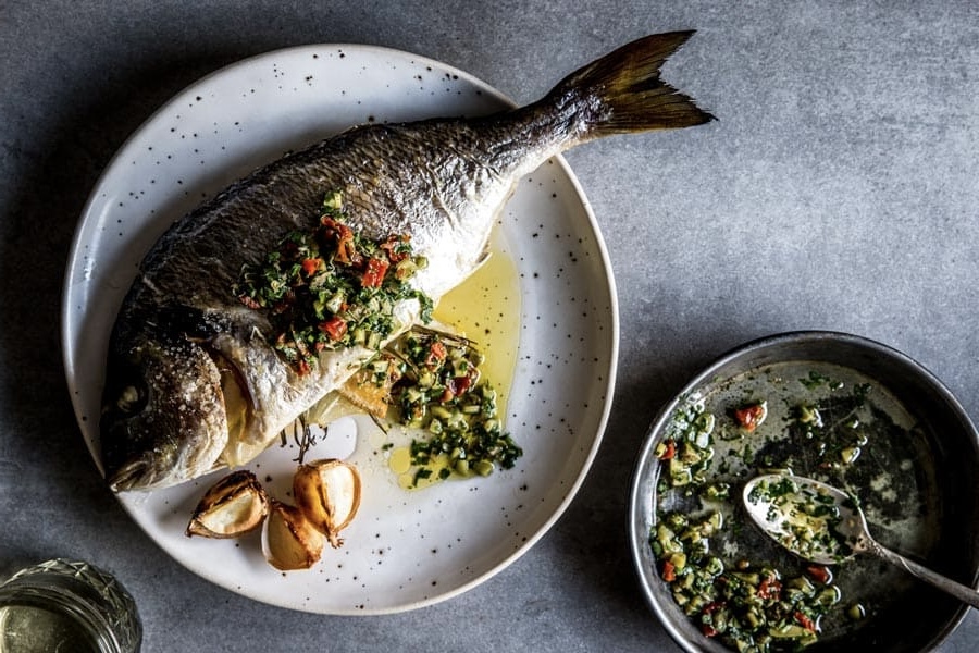 6. أدخلي الصينية إلى الفرن حتى يجف الماء تقريباً عن السمك وينضج تماماً.
