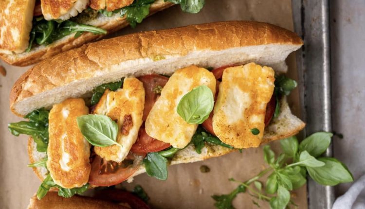 2. وزعي الجبن الحلوم في الخبز ثم الطماطم والجرجير.