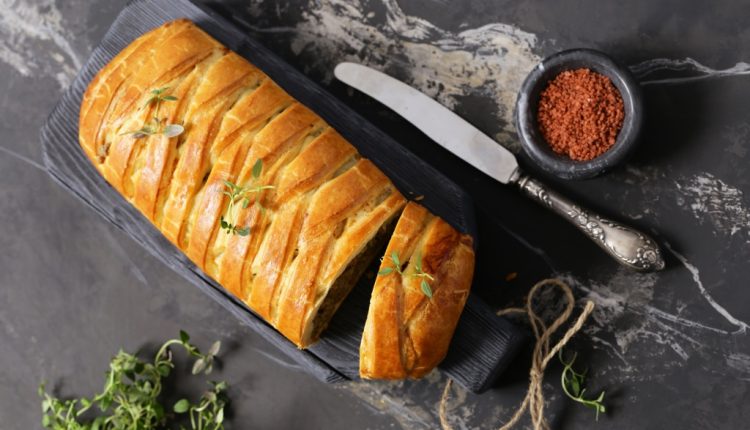 8. ضعي العجينة في صينية مدهونة بالقليل من الزيت وأدخليها الفرن المحمى مسبقاً حتى النضوج ويحمر الوجه قليلاً.